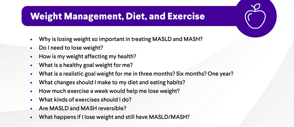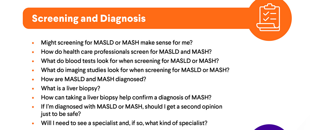 MASLD and MASH often have no early symptoms, which is why regular screening and open conversations with your health care professional are so important. Prepare by reviewing common questions you can ask at your next appointment.